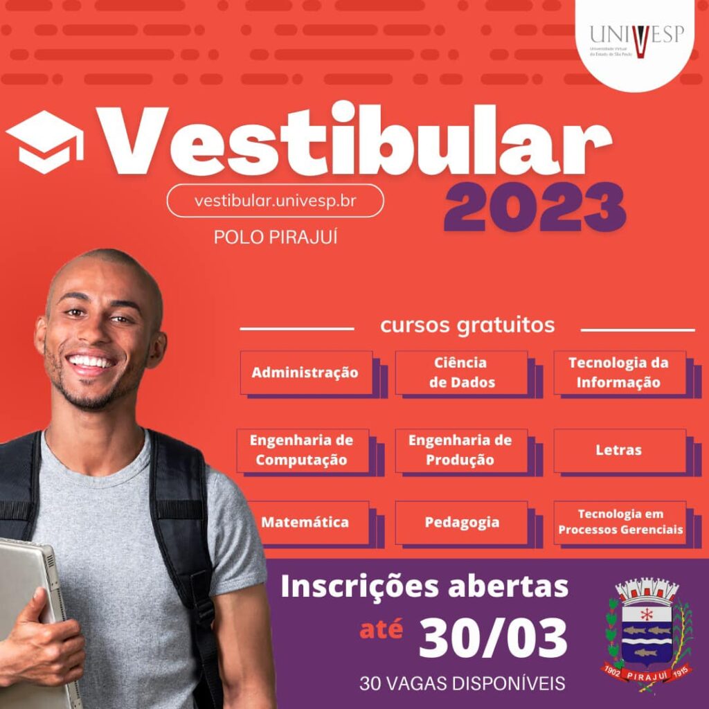 Inscrição para vestibular da Univesp vai até 30/03 A Universidade Virtual do Estado de São Paulo (Univesp), com polo em Pirajuí, está oferecendo 30 vagas de cursos de graduação nos eixos de Licenciaturas (Letras, Matemática e Pedagogia), Computação (Bacharel em Tecnologia da Informação, Ciência de Dados ou Engenharia de Computação) e Negócios e Produção (Tecnólogo […]