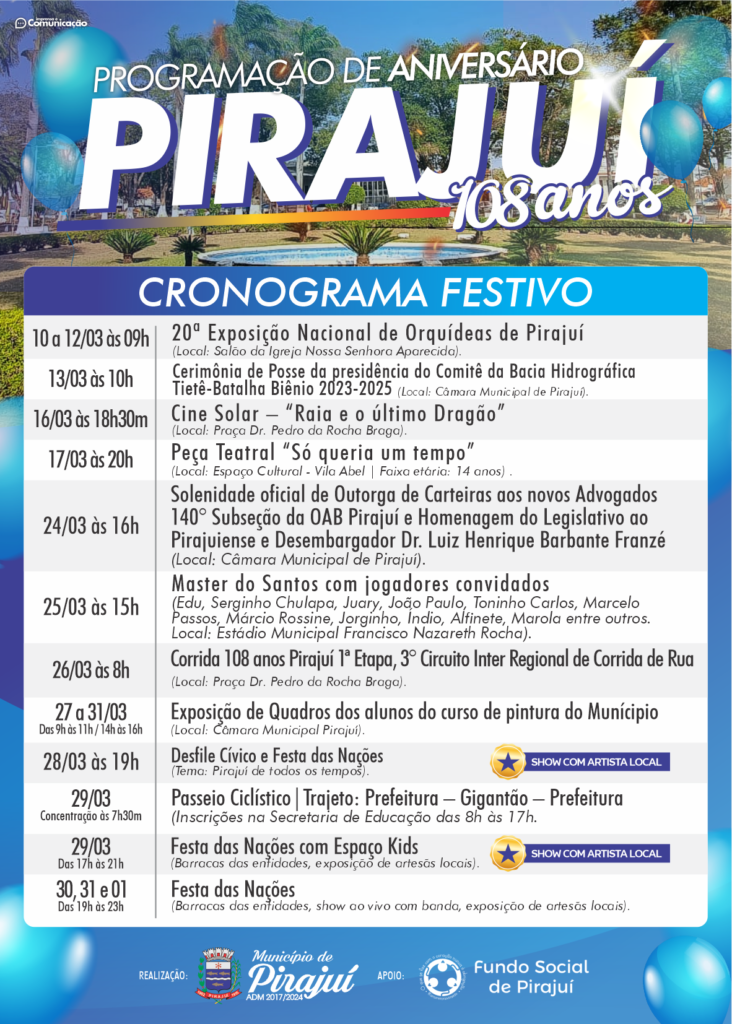 Confira a programação para março em Pirajuí, mês de aniversário da cidade