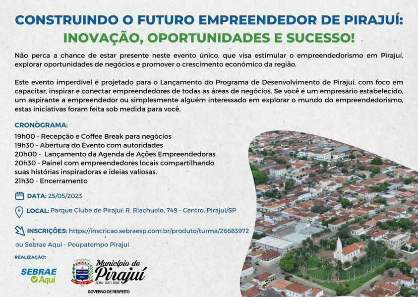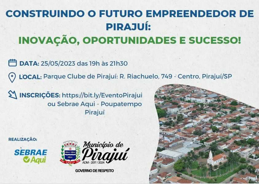 O Sebrae (Serviço Brasileiro de Apoio às Micro e Pequenas Empresas), em parceria com a Prefeitura Municipal de Pirajuí, promoverá nesta quinta-feira (21), às 19h, no Parque Clube de Pirajuí, um evento especial voltado a empreendedores de todas as áreas e àqueles que possuem interesse em abrir um negócio próprio.