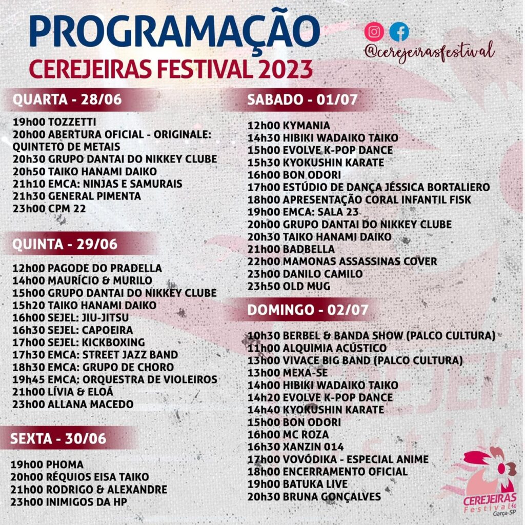 O Cerejeiras Festival, como é chamado atualmente, é gratuito e promete envolver toda a região de Garça.