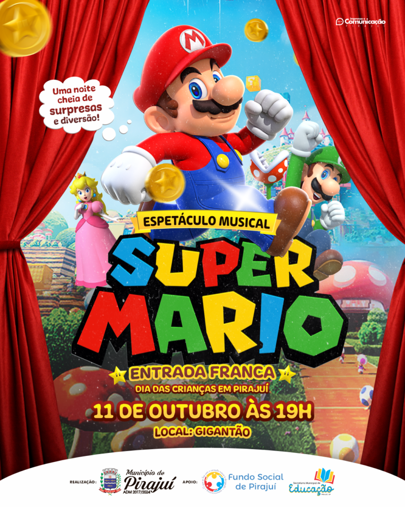 O grande destaque da noite será o espetáculo musical “Super Mário Bros”, que promete encantar crianças e adultos com suas performances divertidas e envolventes. O melhor de tudo é que a entrada será franca, proporcionando uma noite cheia de surpresas e diversão.