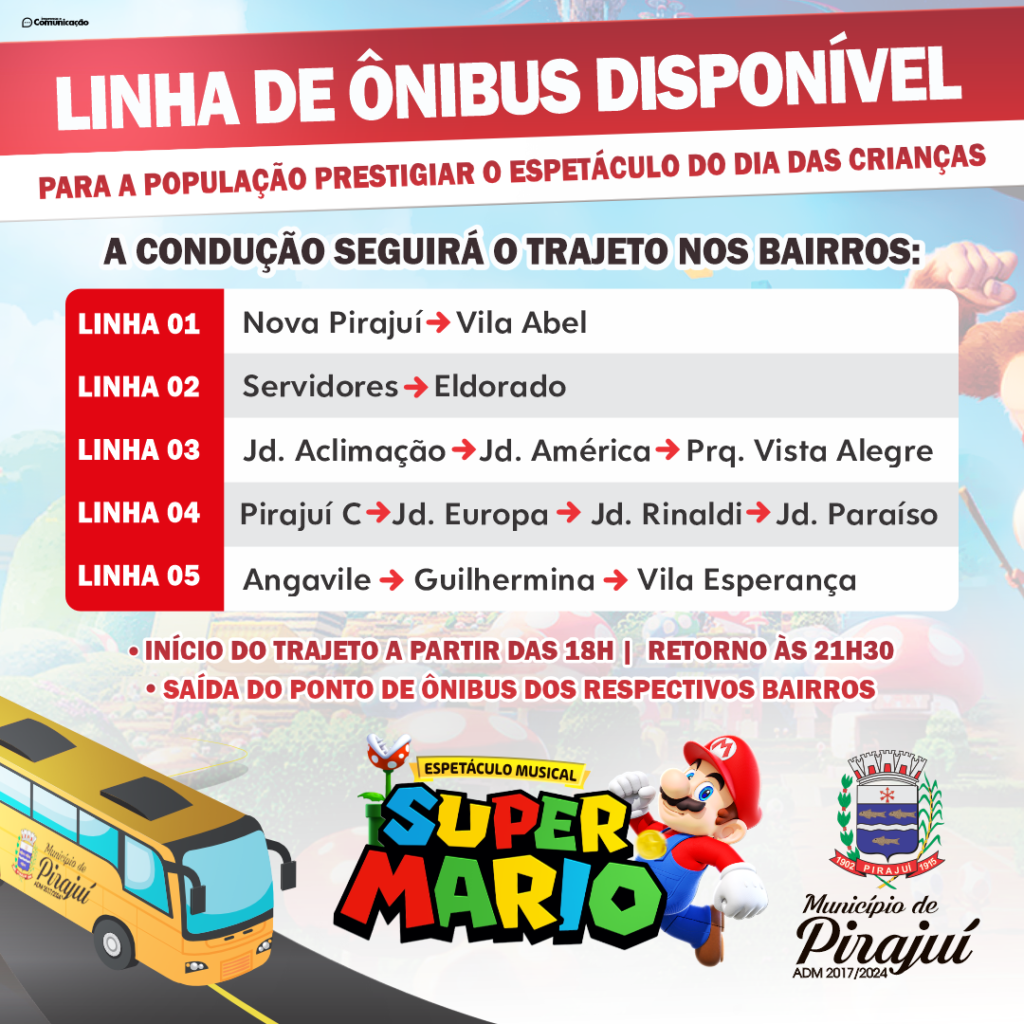 Para garantir que todas as crianças de Pirajuí possam participar deste espetáculo incrível, a organização está disponibilizando transporte gratuito. Cinco ônibus circularão por toda a cidade para levar os pequenos e suas famílias até o local do evento (veja o cronograma abaixo).