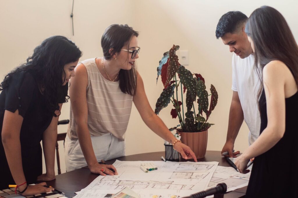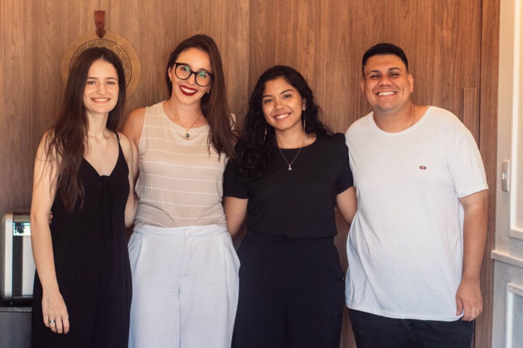 Hoje temos quatro pessoas no nosso time: Eu, a Jade, que também é arquiteta, o Marcos e a Débora, que são universitários. Nossa equipe é muito comprometida e focada em resultados.
