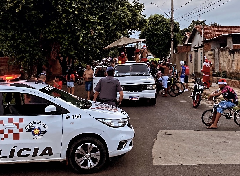 O grupo seguia um caminhão de guincho, com um Papai Noel em cima que entregava balas e pirulitos às crianças.