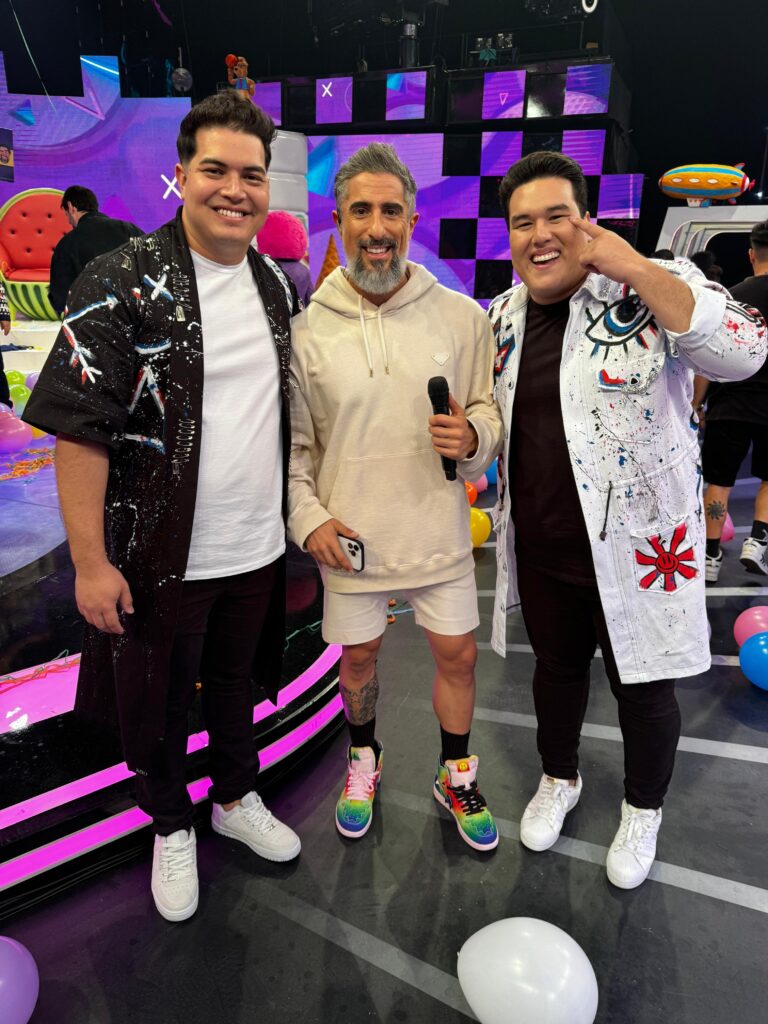 Além de contarem a história de sua trajetória artística para o Brasil, a dupla ainda presenteou o irreverente apresentador Marcos Mion com um kimono personalizado.