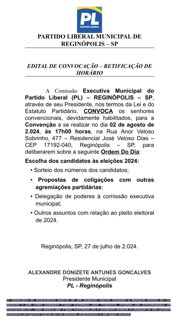 A Comissão Executiva Municipal do Partido Liberal (PL) – REGINÓPOLIS – SP,através de seu Presidente, nos termos da Lei e do Estatuto Partidário, CONVOCA os senhores convencionais, devidamente habilitados, para a Convenção a se realizar no dia 02 de agosto de 2.024, às 17h00 horas, na Rua Anor Veloso Sobrinho, 477 – Residencial José Veloso Dias – CEP 17192-040, Reginópolis – SP, para deliberarem sobre a seguinte Ordem Do Dia: