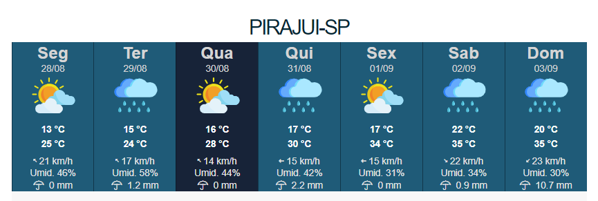 A previsão do tempo é de chuva, com um sol tímido e muitas nuvens para essa semana que começou. De acordo com o IPMet, instituto de meteorologia de Bauru, a terça-feira (29) será chuvosa, com mínimas de 13º e máximas que podem chegar a 25º. A chuva também cairá na quinta-feira (31), no sábado (02/09) […]